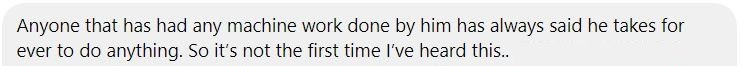 We’re in May at this point and I start calling and messaging frequently to arrange the collection of all my parts, a nightmare in itself. The head guy wants nothing to do with any of it, tired of being hounded by disgruntled DM customers, and Dale is not in Sydney, my guess being he’s shafted many others who are not as polite or restrained. Naturally, Dale also has personal issues complicating matters, apparently, he’s hurt his hand this time…
